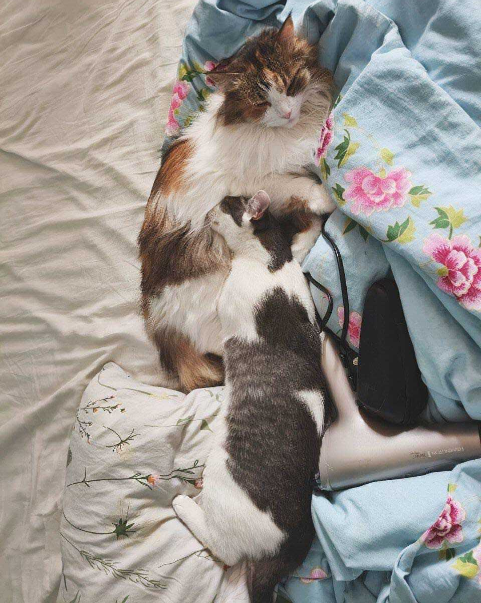 Котик Френк нашел дом и спит на пушистом животике своей подруги