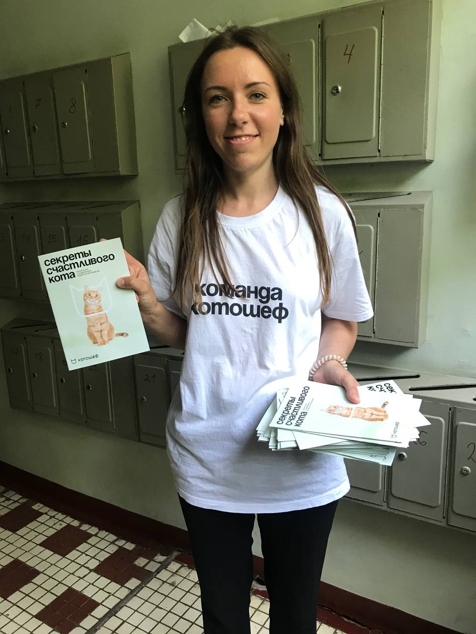 Первый ловец проекта - Маша, раскладывает наши брошюрки о котиках жителям двора